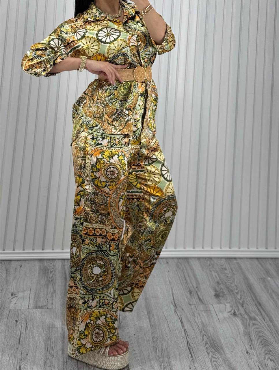 این ست چشمگیر از پارچهی لطیف و براق ساتن طراحی شده و جلوهای بینظیر از راحتی و شیکپوشی را برایت فراهم میکند. شومیز آزاد با قد ۷۰ سانتیمتر در کنار شلوار دمپا گشاد ۱۱۰ سانتیمتری، ترکیبی بینقص از سبکی، آزادی حرکت و زیبایی است. این ست نهتنها برای استفاده روزمره کاربردی است، بلکه به دلیل طراحی و جنس خاص، استایلی شیک و متفاوت خلق میکند که در دستهی ست لباس زنانه جایگاه ویژهای دارد.