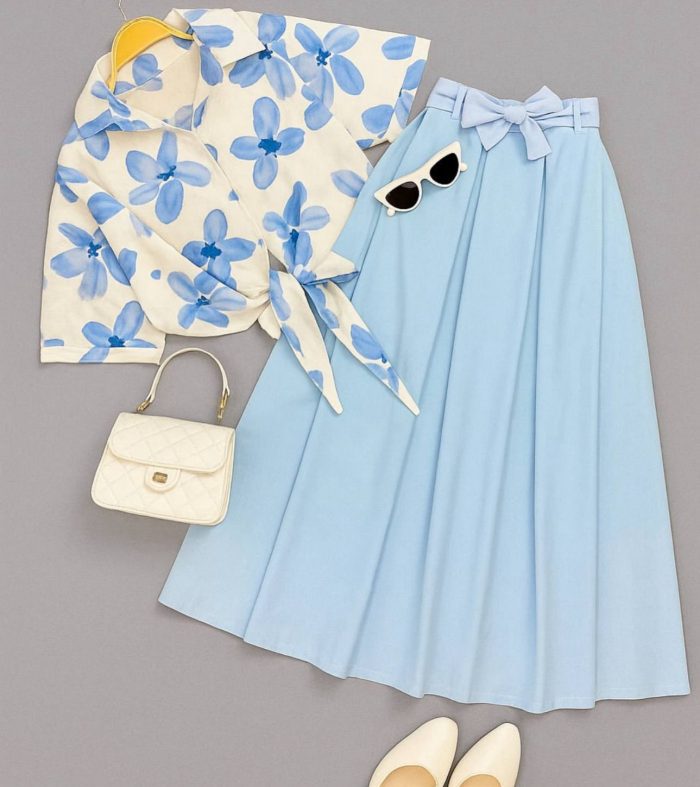 ست دامن و شومیز ابر‌و‌بادی جلوگره آبی