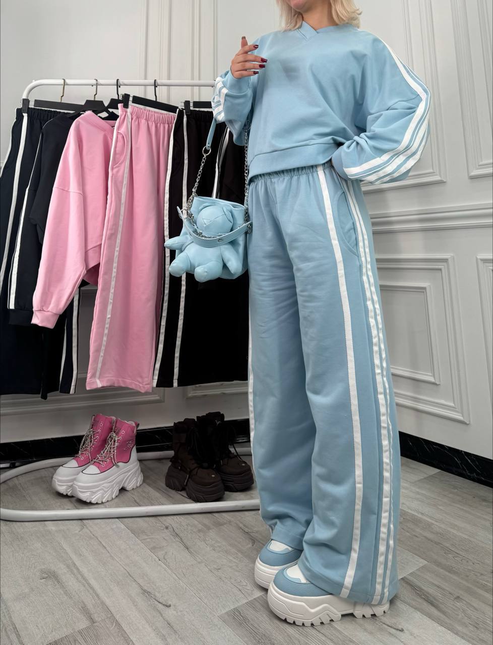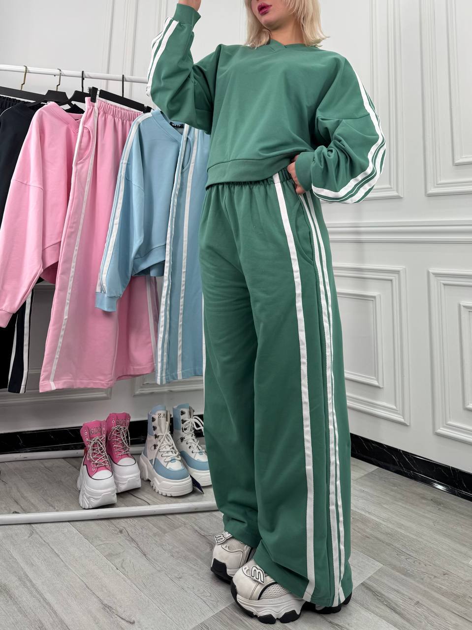 رنگبندی این محصول بهگونهای انتخاب شده که طرفداران ست رنگ آبی کلاسیک، ست رنگ صورتی روشن و حتی ست رنگ سبز را راضی کند. این تنوع رنگ باعث شده هم برای استایلهای روزمره و هم برای موقعیتهای نیمهرسمی مناسب باشد. فرم کلی لباس، آن را به یک ست زنانه بیرونی کاربردی تبدیل کرده که برای پیادهروی، خرید یا دورهمیهای دوستانه انتخابی بیدردسر است.