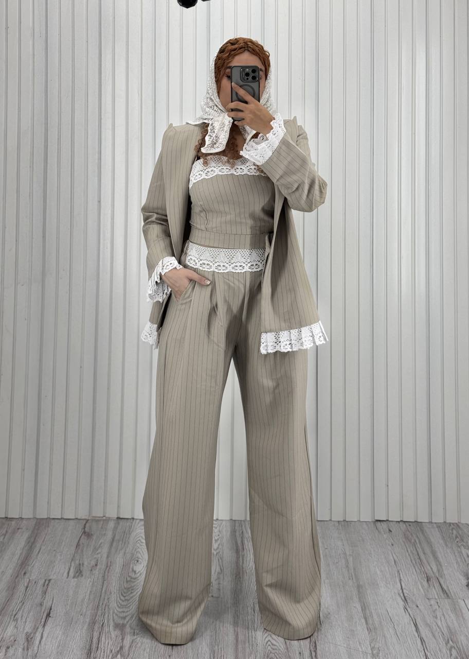 طراحی سهتیکه با تاپ کوتاه ۲۱ سانتیمتری، کت ۷۳ سانتیمتری و شلوار بلند ۱۱۴ سانتیمتری، ترکیبی کامل و جذاب برای دختران خوشاستایل است. همین ترکیب باعث شده تا این کار یک ست زنانه عروسکی دوستداشتنی نیز باشد. از سوی دیگر، دوخت تمیز و فرم خاص لباس، آن را به یک ست زنانه شیک تمامعیار تبدیل کرده است.