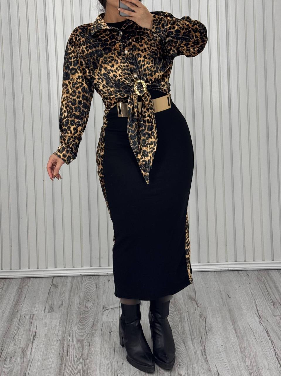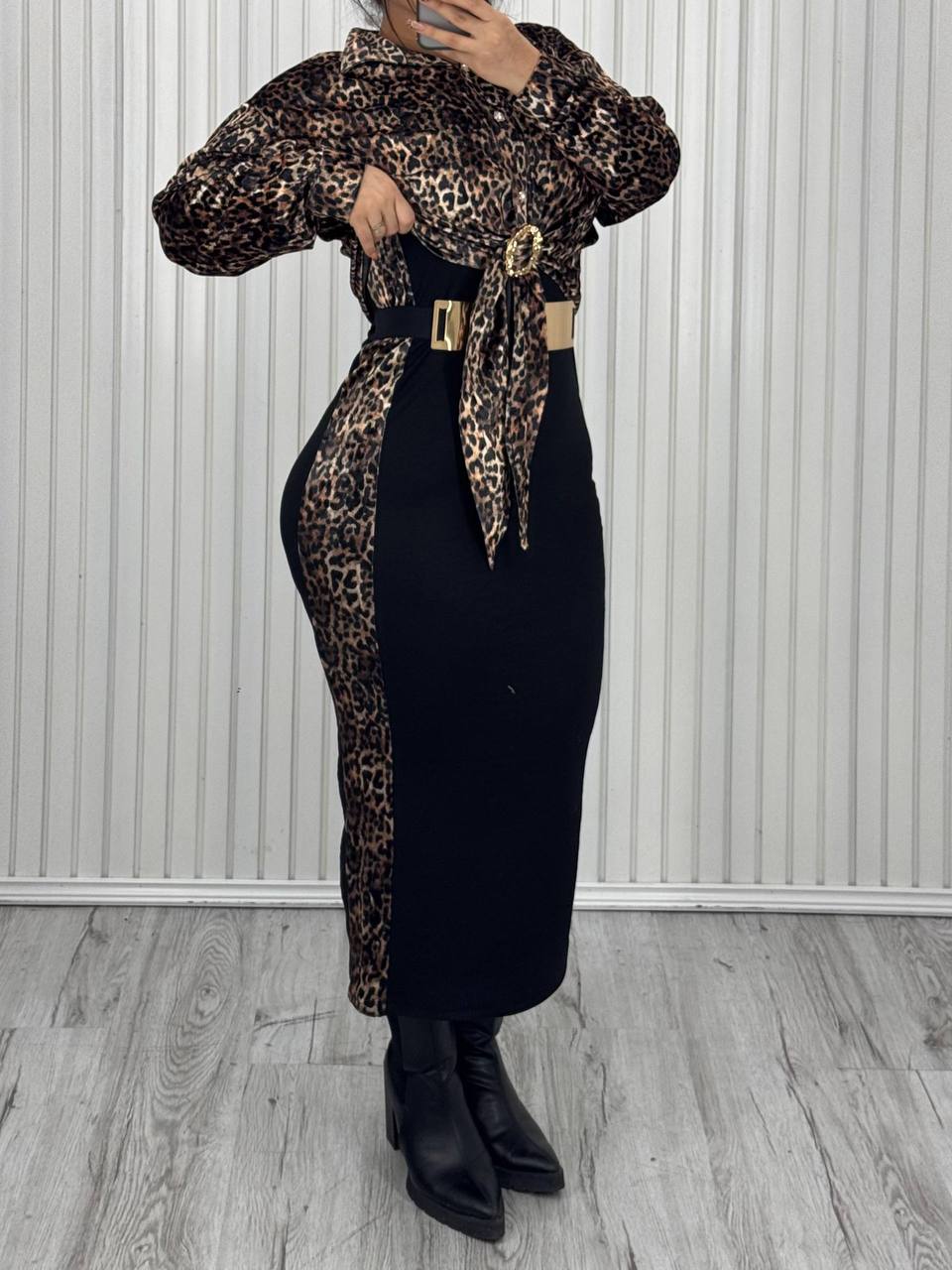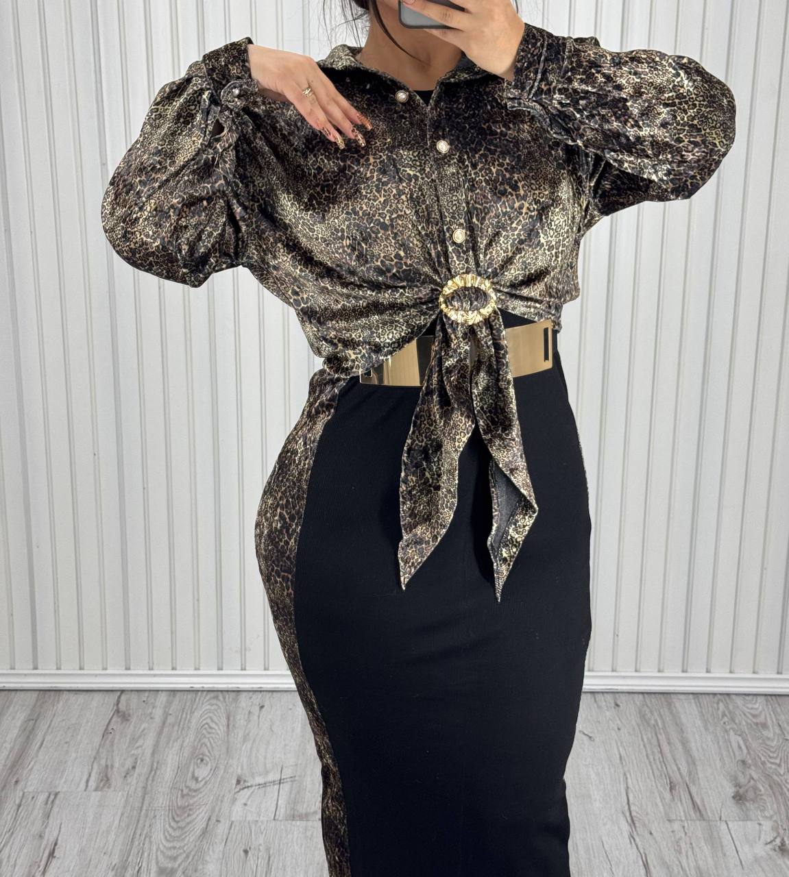 طرح خاص بافت پارچه و رنگ گرم نسکافه‌ای، در کنار جزئیات طلایی، جلوه‌ای از طرح‌های حیوانی لطیف را تداعی می‌کند که باعث شده تا از خاص‌ترین ست لباس پلنگی زنانه‌های مجموعه باشد.