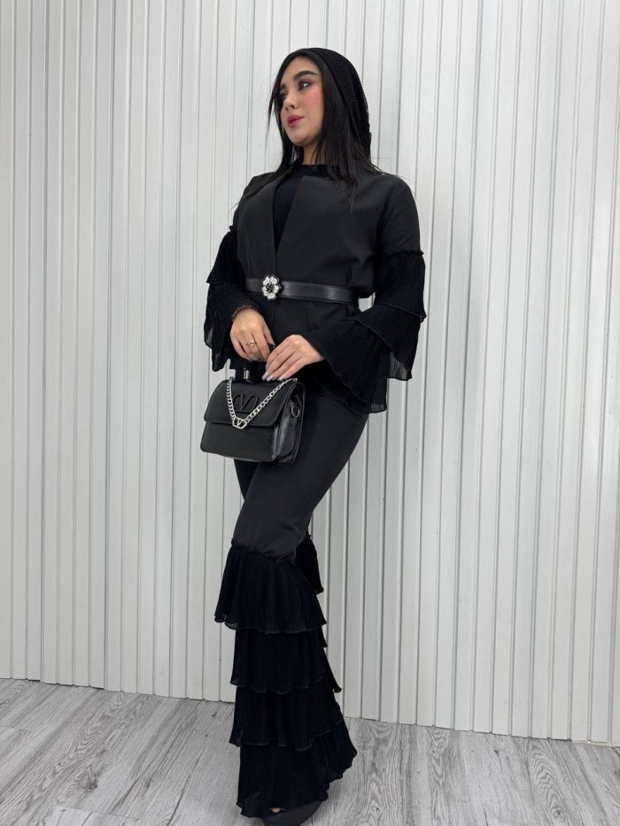 یک ست لباس زنانه خاص میتواند استایل شما را در هر جمعی به اوج برساند. ست کت و شلوار کرپ مازراتی با جزئیات پلیسهای و طراحی متفاوت، ترکیبی از اصالت و مدرنیته است که برای دختران خوشسلیقه طراحی شده. استفاده از پارچهی کرپ مازراتی به همراه تور، جلوهای مجلسی و شیک به این کار بخشیده است.