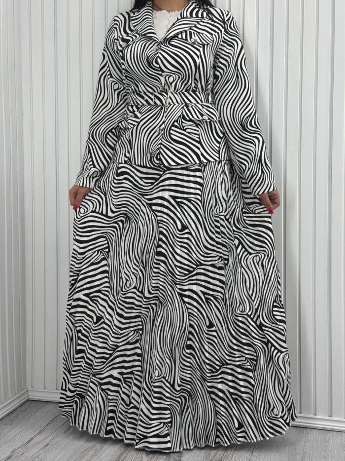 یک ست لباس زنانه شیک و متفاوت همیشه می‌تواند استایل شما را به نقطه‌ی اوج برساند. این بار با معرفی ست کت و دامن کرپ طرح‌دار به سراغ یکی از خاص‌ترین انتخاب‌ها می‌رویم؛ محصولی که با رنگ سفید و مشکی و طرح‌هایی همچون زبرا، ببری، پلنگی و هیپنو طراحی شده است. این ترکیب خاص، نمایشی از جسارت و ظرافت است و برای دخترانی که به دنبال متفاوت بودن هستند، بهترین گزینه محسوب می‌شود.