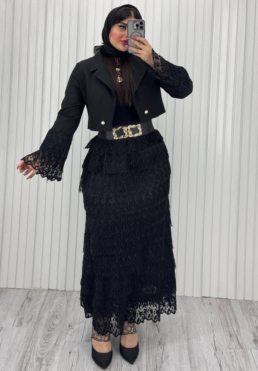 این ست با رنگ و طرح گل مشکی و برگ مشکی ساخته شده که باعث میشود در عین سادگی، بسیار چشمگیر باشد. جزئیات گیپور دامن حالتی ست زنانه عروسکی و لطیف به استایل تو میدهد، در حالی که برش کت نمایی رسمیتر و ست زنانه شیک خلق میکند.