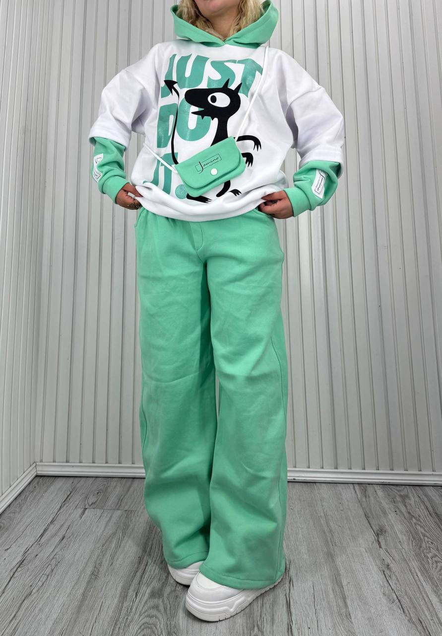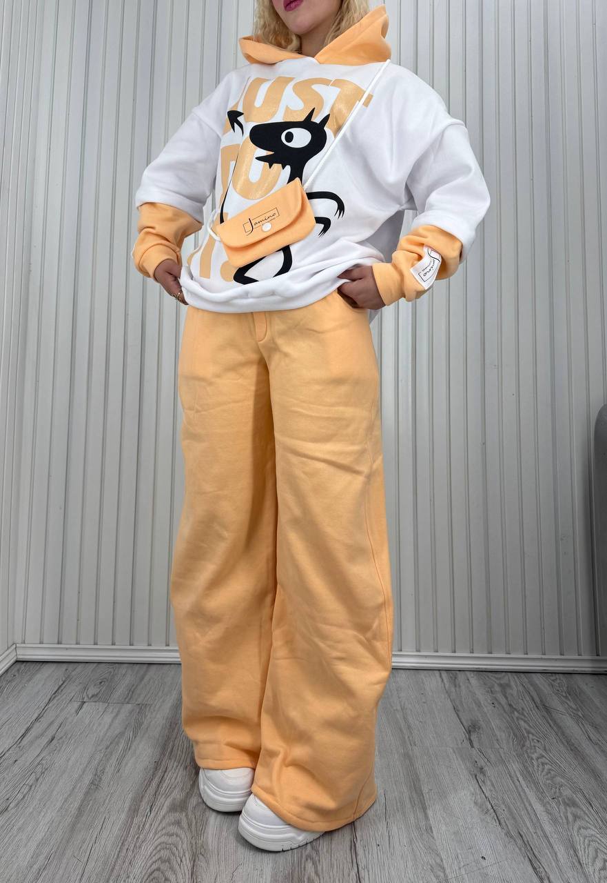 طراحی مینیمال هودی، نوشته‌ی چاپی مدرن و ترکیب آستین دو رنگ، ظاهری خاص و پرانرژی به لباس داده است. همین سبک طراحی باعث شده تا از زیباترین مدل‌های ست لباس زنانه اسپرت در این فصل باشد.