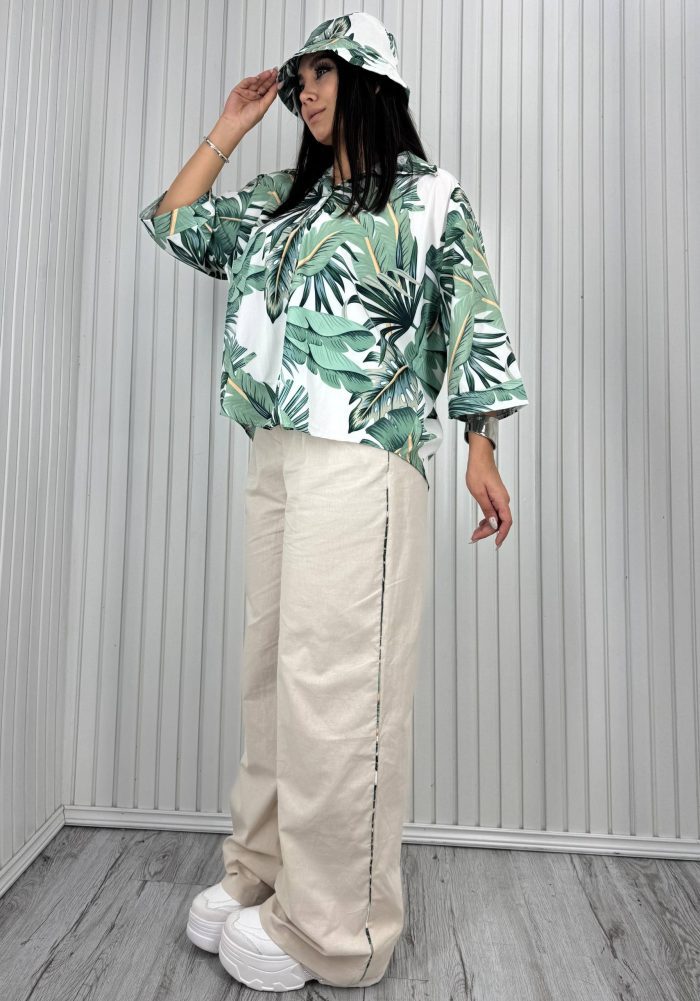 طرح برگ، پروانه و آووکادو روی شومیز، حالتی شاداب و فانتزی به لباس داده است. همین ویژگی، آن را به یک ست زنانه عروسکی دلبرانه تبدیل میکند که هر دختری میتواند برای داشتن لحظاتی شاد و پرانرژی سراغش برود. در عین حال، طراحی ساده و دوخت تمیز آن، جایگاه این ست را در گروه ست زنانه شیک هم تثبیت کرده است. با وجود سه تکه بودن، این مدل یک ست زنانه سه تیکه کامل به حساب میآید که همراه کلاه همطرح ارائه میشود. همین امر باعث شده در روزهای داغ تابستان، بهترین همراه برای بیرونرفتن باشد و بهعنوان یک ست زنانه تابستانی خنک و زیبا بدرخشد.