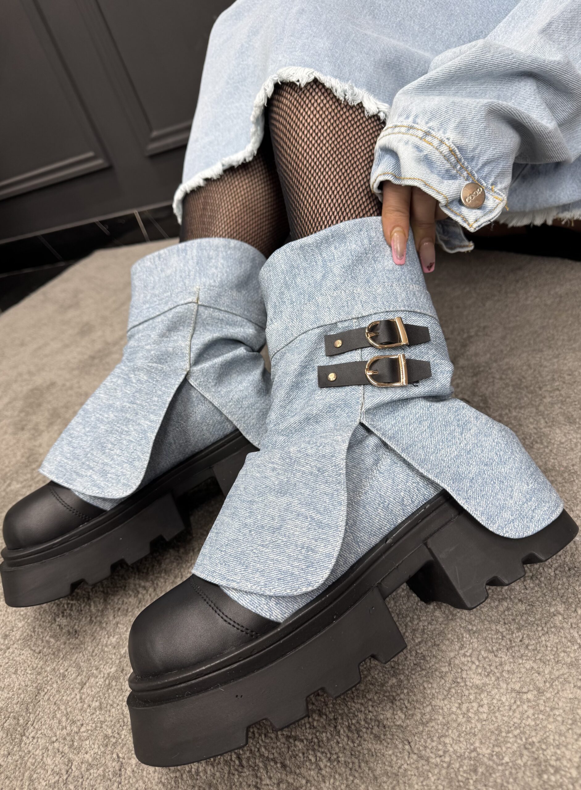 نیم بوت جین بقل سگک دار با لژ نیمه بلند و رویه پارچه جین بسیار زیبا و خاص در فروشگاه کویین گالری.