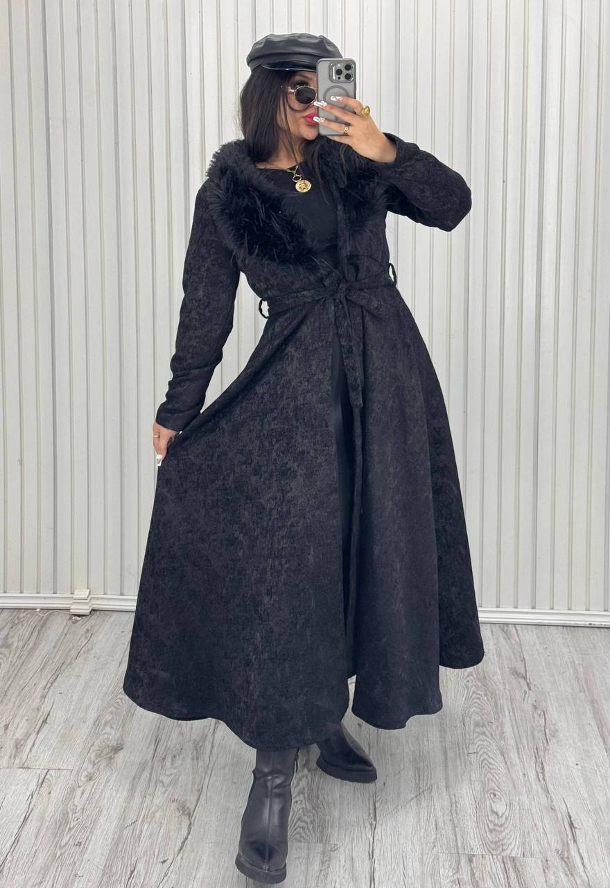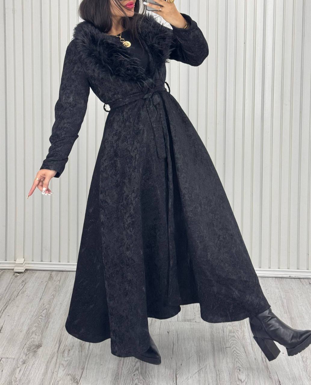 در نگاه اول، بافت مخمل براق و طرح پوست ماری آن، زیبایی و درخشش را تداعی میکند. این پارچه در کنار دوخت دقیق و ظریف، به پالتو اسپرت ظاهری مجلل و در عین حال مدرن داده است. مدل یقهی خزدار و کمربند ظریف دور کمر باعث شده تا لباس در گروه خاصترین پالتو بلندهای مجموعه قرار گیرد؛ مدلی که هم برای روزهای سرد پاییز و هم برای شبهای زمستانی فوقالعاده است.
