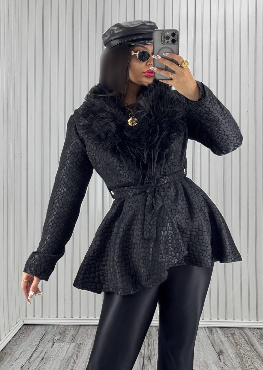 فرم کوتاه این مدل در کنار برش خاص قسمت پایین، باعث شده تا یکی از محبوبترین پالتو کوتاههای مجموعه باشد. یقهی خزدار و حالت کمربنددار لباس در قسمت کمر، استایلی زنانه و شیک میسازد که در میان پالتو عروسکی کوتاهها بسیار محبوب است. بافت براق پارچه و حالت پفی یقه نیز به لباس جلوهای ظریف و فانتزی داده تا در ردهی خاصترین پالتو عروسکیها جای بگیرد.