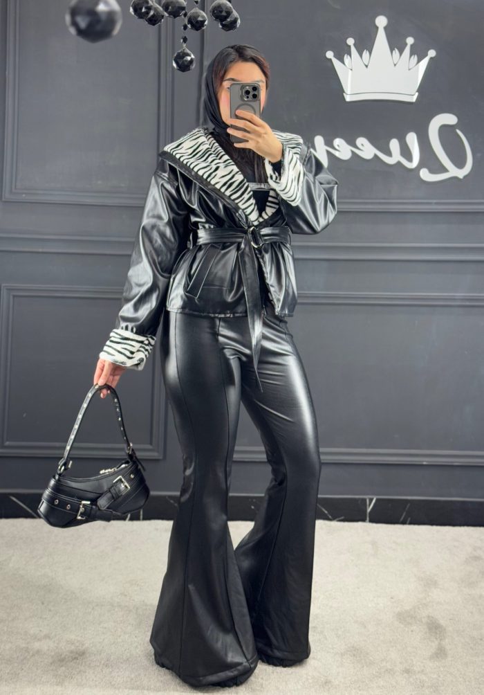 استفاده از چرم مرغوب در طراحی این لباس، نهتنها زیبایی ظاهری بلکه دوام بالایی نیز ایجاد کرده است. بافت نرم و درخشان چرم در نور، حس قدرت و اعتمادبهنفس میدهد — همان وقار و جسارت خاص یک کت تک زنانه مجلسی واقعی. در کنار آن، تضاد رنگ مشکی و طرح گورخری در یقه و سرآستینها، جلوهای متفاوت و خاص ایجاد کرده است؛ ترکیبی جسورانه و بینقص که در هر استایلی میدرخشد.