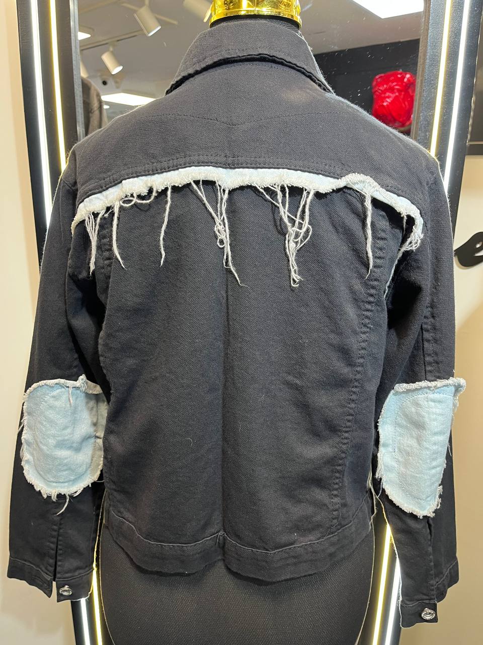 فرم تنخور آزاد و یقهدار آن باعث میشود در کنار زیبایی، راحتی بینظیری نیز داشته باشد. پارچهی اصلی از کت جین با ترکیب پارچهی مشکی مات دوخته شده که با پرچهای فلزی کوچک تزئین شده است. همین جزئیات مدرن باعث شده در میان کت جین دخترانهها یکی از منحصربهفردترین مدلها باشد.